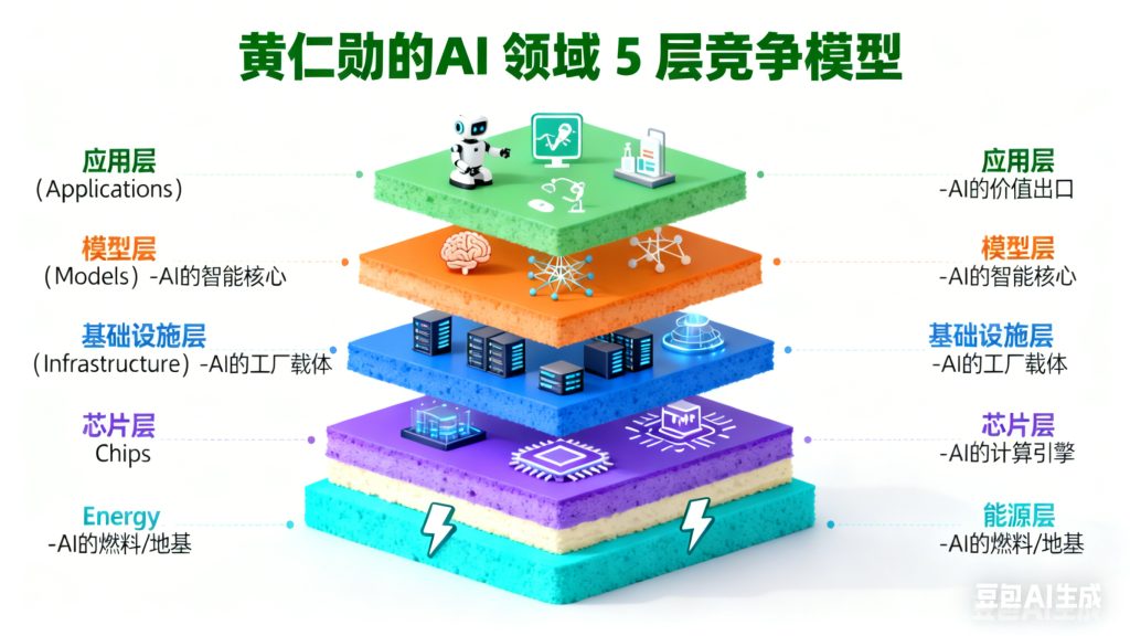 在AI方面,黄仁勋提出的5层竞争模型: